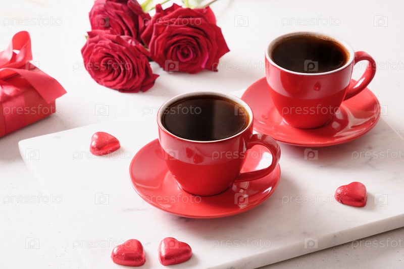 День святого валентина с кофе, конфетами из красного шоколада и розовыми цветами на белом. Закрыть