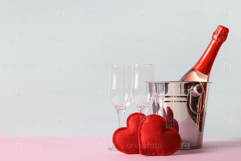 Композиция на день святого валентина из шампанского, два войлочных сердца, бокалы на синем
