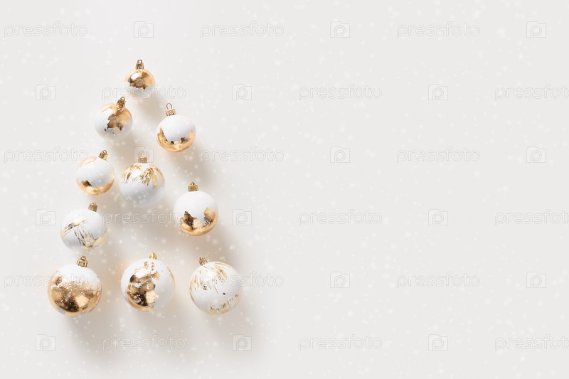 Баннер с современной елкой из золотых и белых шаров на белом фоне. Декоративные шары в форме елки. Рождественская открытка с копией пространства. С Новым Годом
