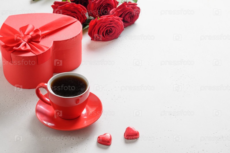 День святого Валентина кофе, красный подарок и красные розы на белом фоне. Приглашение на свидание. Закрыть. Скопируйте пространство