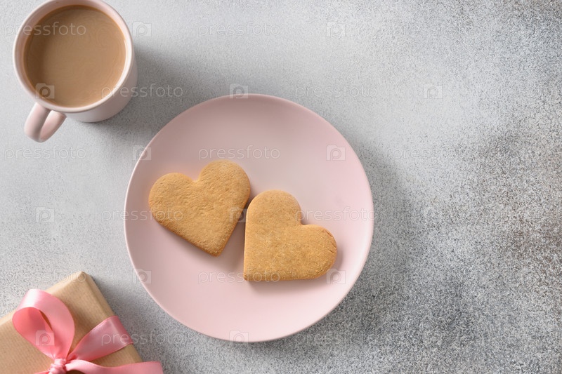День святого Валентина завтрак с кофе, печенье в форме сердца на розовой тарелке на сером столе. Вид сверху. Скопируйте пространство