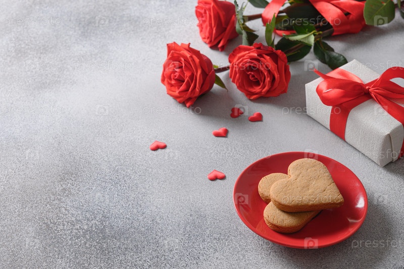 День святого Валентина два печенья в форме сердца и романтический подарок, букет красных роз