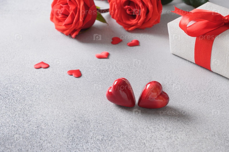 День святого Валентина две сладости в форме сердца и романтический подарок, букет красных роз