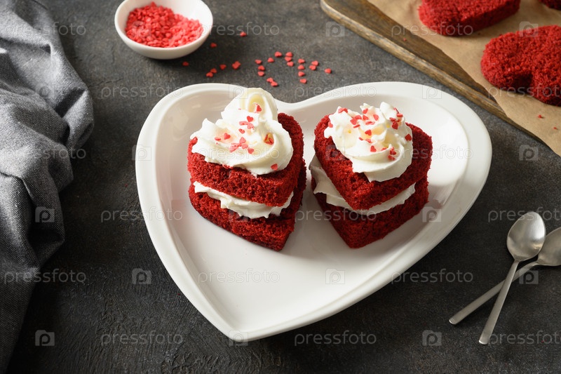 Красный бархатный торт в форме сердца на День святого Валентина. Вкусный домашний десерт