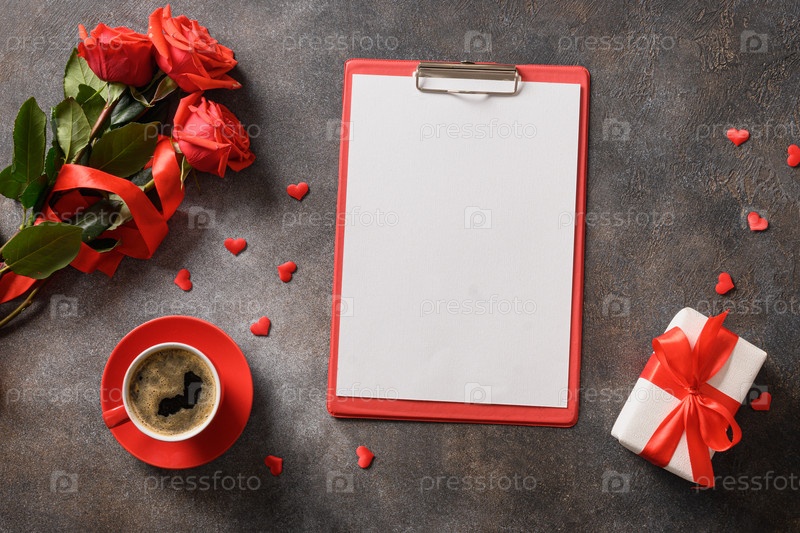 Валентинка с кофе, подарком, розами и любовным письмом