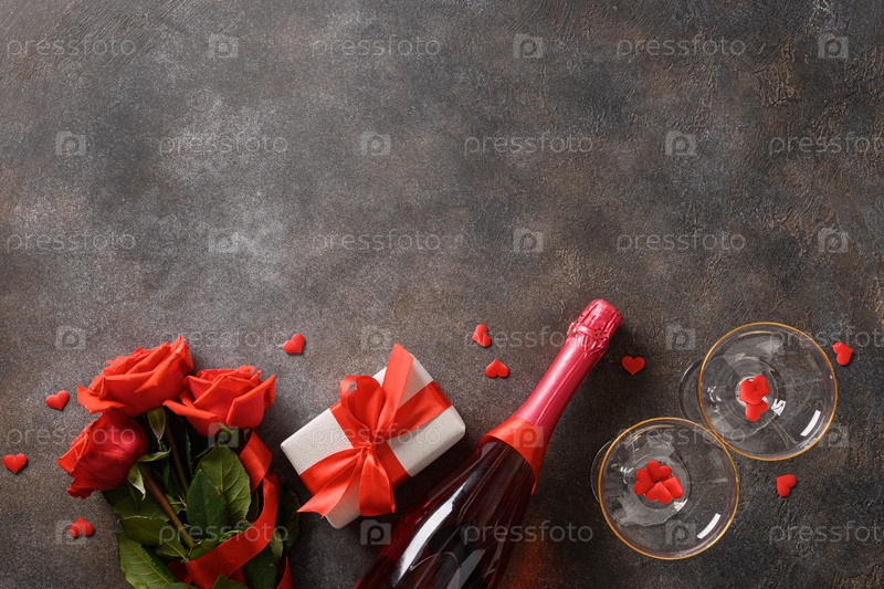 Валентинка с игристым вином или шампанским, красным подарком и красными розами. Вид сверху. Скопируйте пространство