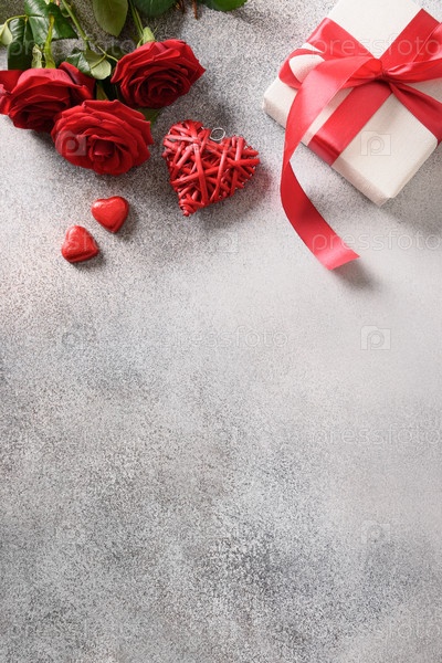 Состав валентинки с подарками, розами, сладостями и любовным письмом на сером фоне. Вертикальный формат. Вид сверху. Скопируйте пространство