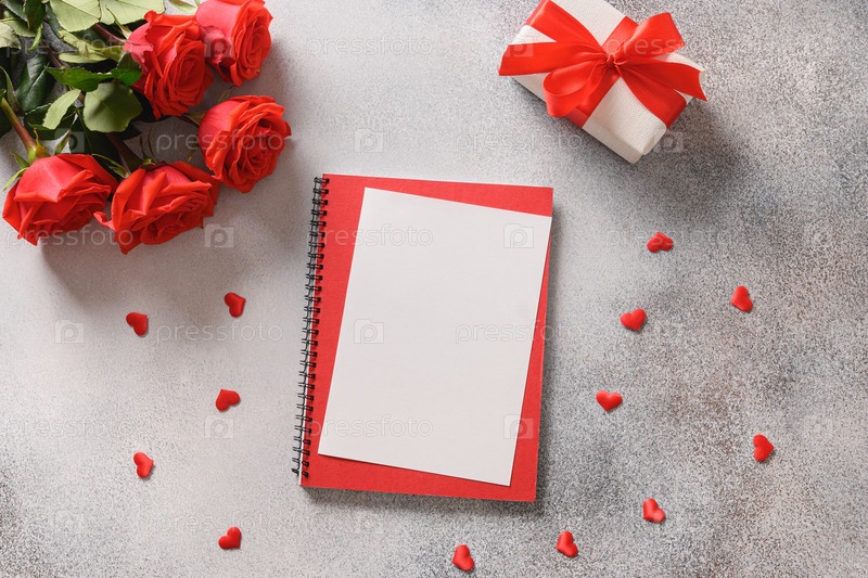 Валентинка с красным конвертом, розами, романтическим подарком на сером фоне. Вид сверху. Скопируйте пространство