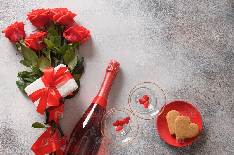 Композиция на день святого валентина с шампанским, любовным подарком, печеньем в форме сердца и букетом красных роз. Вид сверху. Скопируйте пространство. Открытка