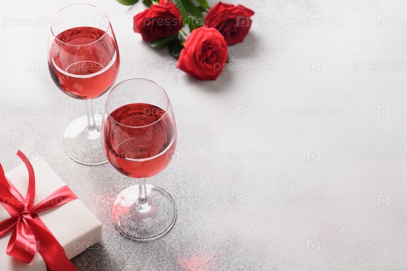 День святого Валентина знакомства с красным вином, букет цветов красных роз и романтический подарок на сером фоне. Скопируйте пространство. Закрыть