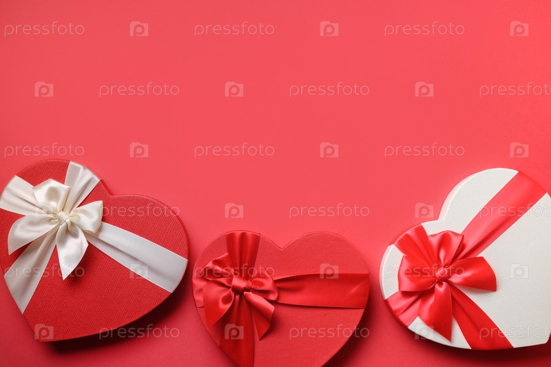 Рамка Дня святого Валентина красных подарков сердец на красном цвете. Плоская укладка. Романтическая открытка