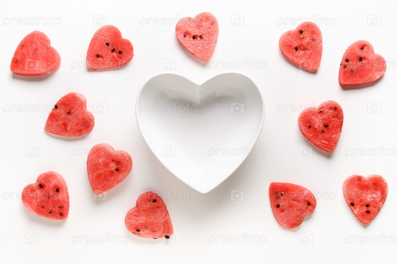 Узор из арбуза, нарезанного сердечками на белом. Концепция еды