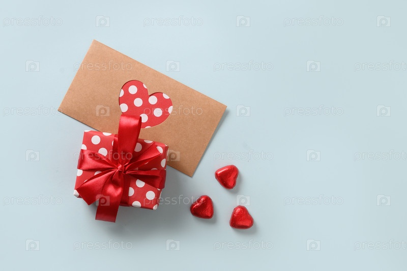 Открытка на день святого валентина, шоколад, подарок и любовное письмо на синем. Скопируйте пространство