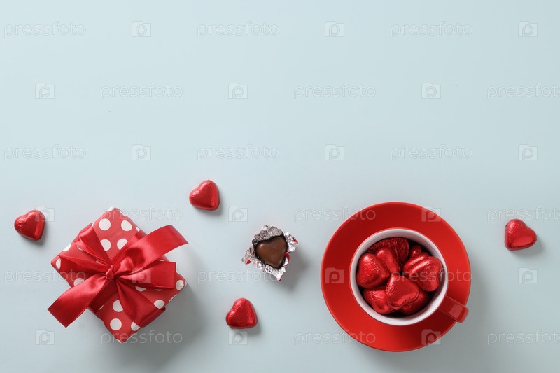 Красные помадки сердца, подарок и чашка на голубом. День Святого Валентина