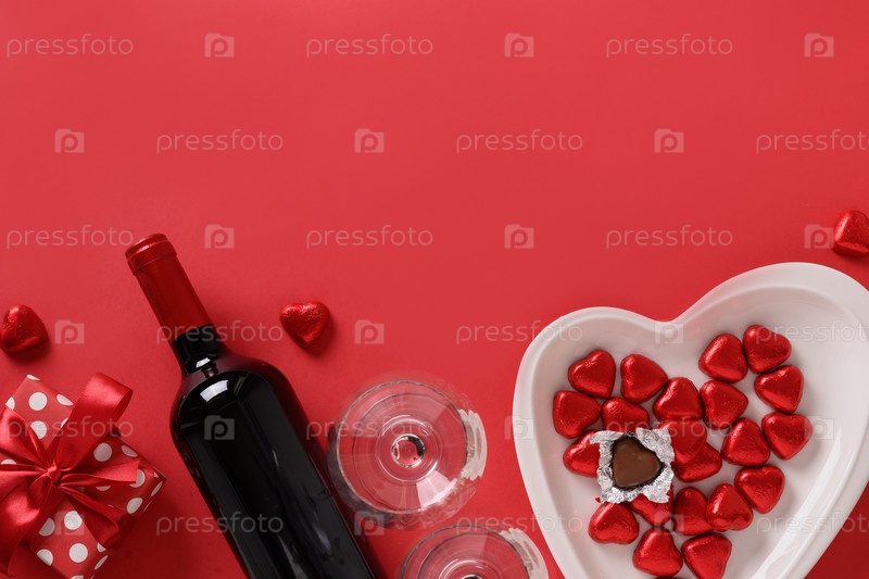Композиция на день святого валентина, шоколадные конфеты и красное вино
