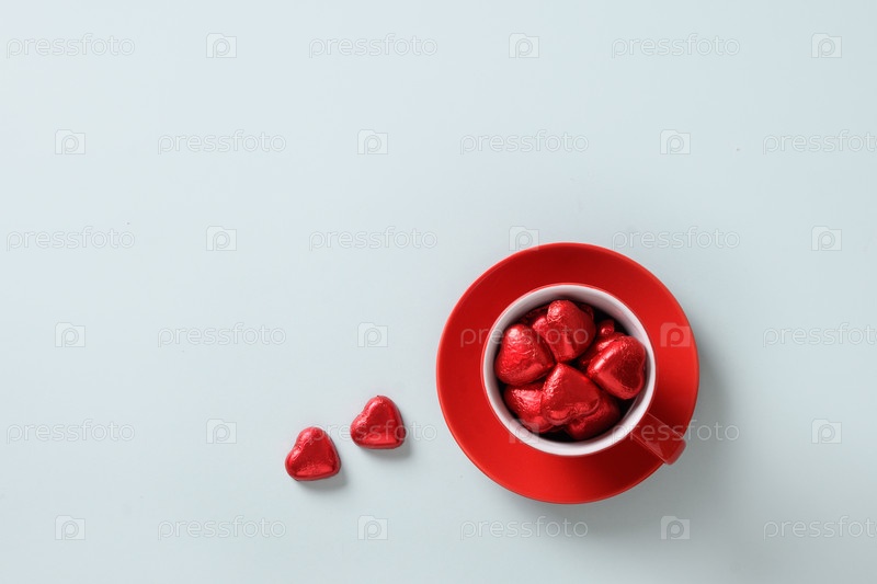 Поздравительная открытка на день святого валентина с красными сердечными сладостями, подарком и чашкой на синем