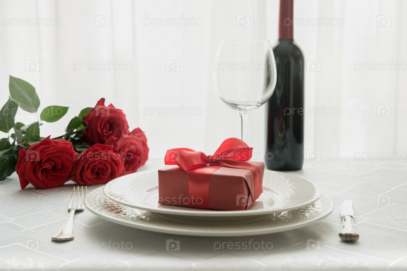 Романтическая сервировка стола с букетом красных роз. Место для текста. Приглашение на свидание. День Святого Валентина