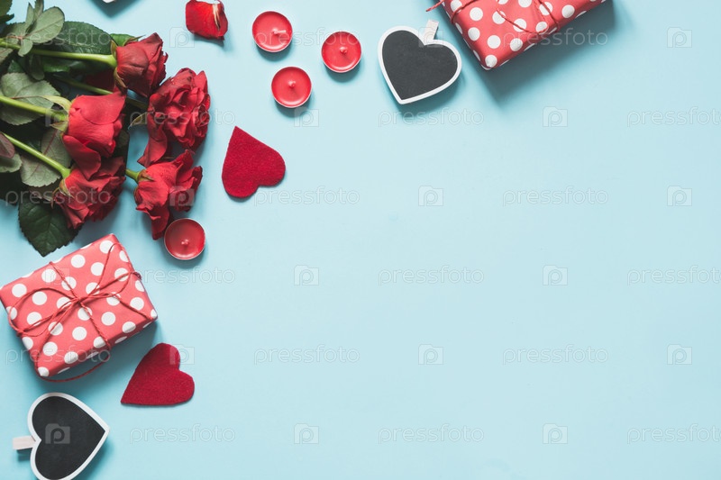 Валентинка с подарками, красные сердца на синем. Вид сверху