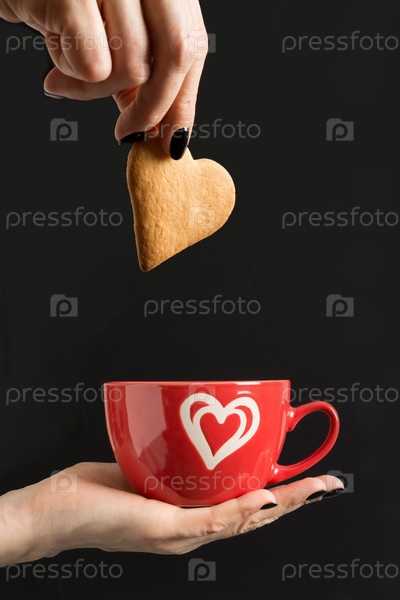 Валентинка. Женщина держит красную чашку кофе и кладет печенье. Изолированные на черном фоне. Концепция