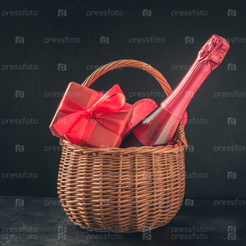 Открытка на день святого валентина с шампанским и красным подарком на черном фоне. Место для ваших поздравлений