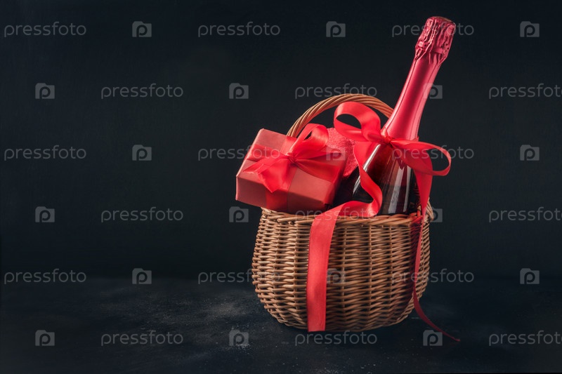 Открытка на день святого валентина с шампанским и подарочной корзиной на черном фоне. Место для ваших поздравлений