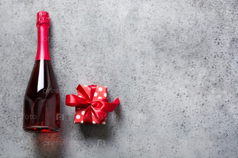 Открытка на день Святого Валентина. Бутылка розового игристого вина и подарочная коробка на сером фоне. Вид сверху. Место для текста