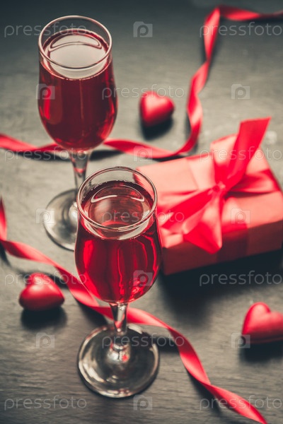 Открытка на день святого валентина с красным шампанским и сердечными конфетами на черном
