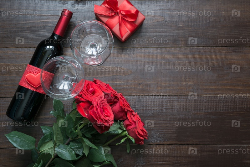Открытка на день Святого Валентина с романтическими красными розами, бутылкой вина, сердцем и красной подарочной коробкой на деревянной доске. Вид сверху с местом для текста