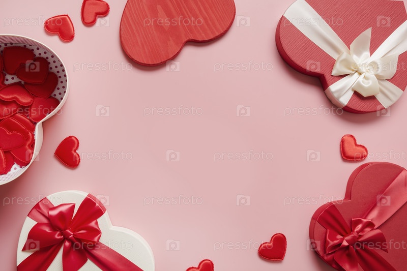 Открытка на день Святого Валентина. Рамка из красных подарочных коробок в форме сердца и много маленьких сердечек на розовом. Вид сверху. Место для текста