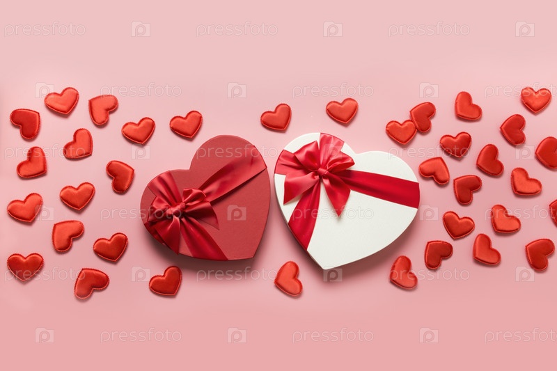 Открытка на день Святого Валентина. Две красные подарочные коробки в форме сердца и много маленьких сердечек на розовом. Вид сверху. Место для текста