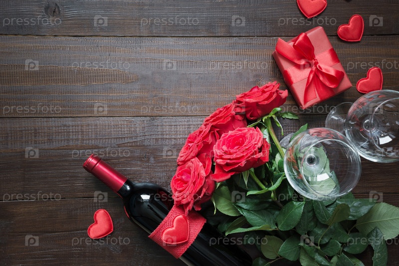 Валентинка с романтическими красными розами, бутылкой вина, сердцем и красной подарочной коробкой на деревянном столе. Вид сверху с пространством