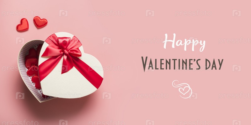 Открытка на день Святого Валентина. Красная подарочная коробка и сердца на розовом. Баннер. Вид сверху