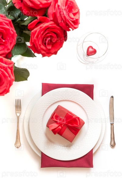 Романтическая сервировка стола с букетом красных роз и подарком. Вид сверху. День Святого Валентина