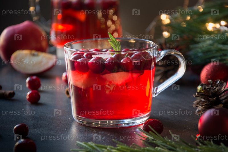 Рождественский клюквенный и яблочный глинтвейн украшают розмарином и еловыми ветками на черном фоне. Рождественский напиток
