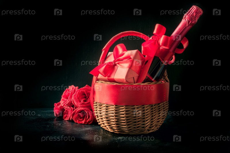 Подарочная корзина на день святого валентина, букет красных роз, бутылка игристого вина на черном столе. Закрыть. Горизонтальный формат. Простор для желаний