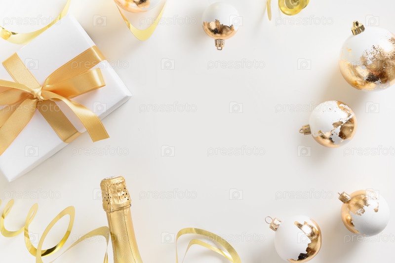 Рождественская композиция с блестящими золотыми шарами, бутылка шампанского на белом фоне. Открытка с копией пространства. С Новым Годом