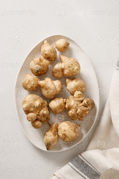 Корень топинамбура, солнечные удушья в белой тарелке и на белом фоне. Вертикальный формат. Вид сверху