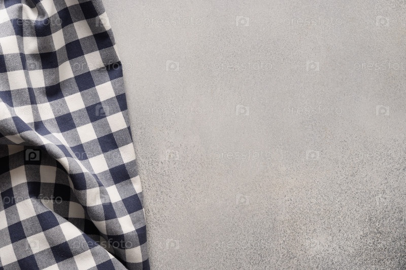Кухонная серая столешница с синим клетчатым полотенцем. Вид сверху. Плоская укладка. Место для вашего дизайна, рецепта или меню