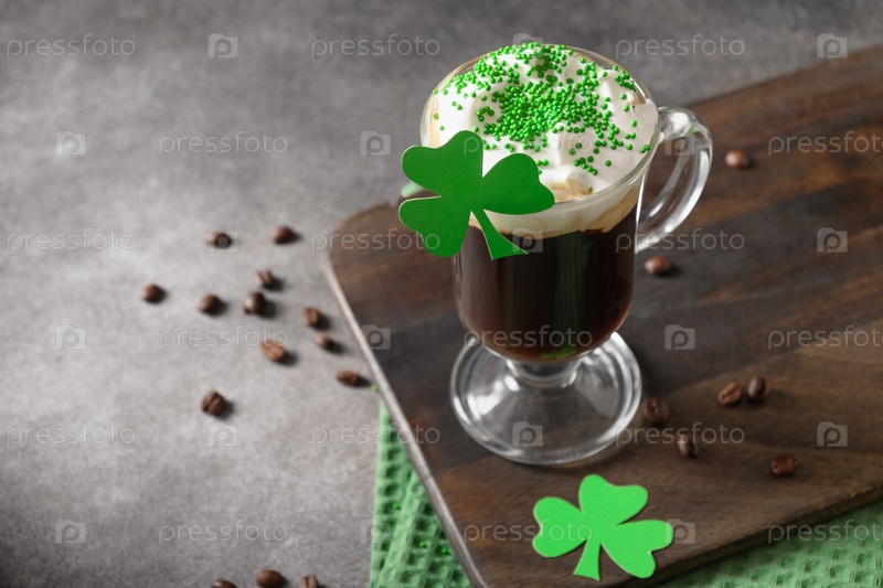 День святого Патрика и празднование с ирландским кофе в стеклянной чашке с зелеными брызгами на сером фоне. Закрыть. Скопируйте пространство