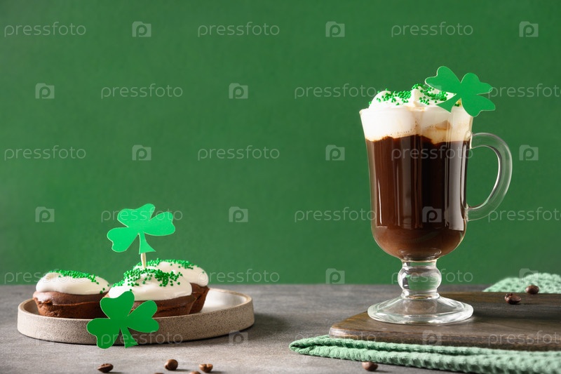 Ирландский кофе и традиционные кексы на День Святого Патрика на зеленом фоне. С днем Патрика