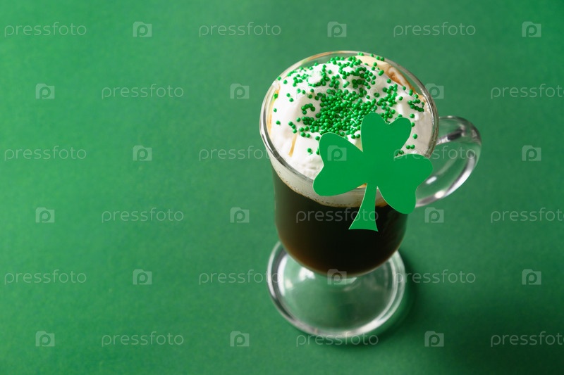 Ирландский кофе в стеклянной чашке на День Святого Патрика