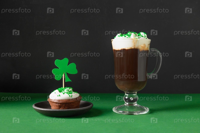 Ирландский кофе в стеклянной чашке и кекс на День Святого Патрика на зеленом и черном фоне. С днем святого Патрика