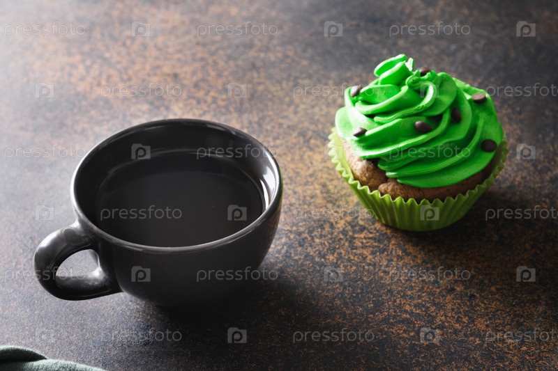 Кофе ко Дню Святого Патрика и кекс с зеленым шоколадом на коричневом фоне
