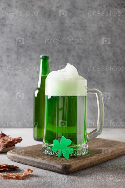 Зеленое пиво дня святого патрика с листьями клевера и вяленым мясом на сером фоне. Вертикальный формат. Закрыть