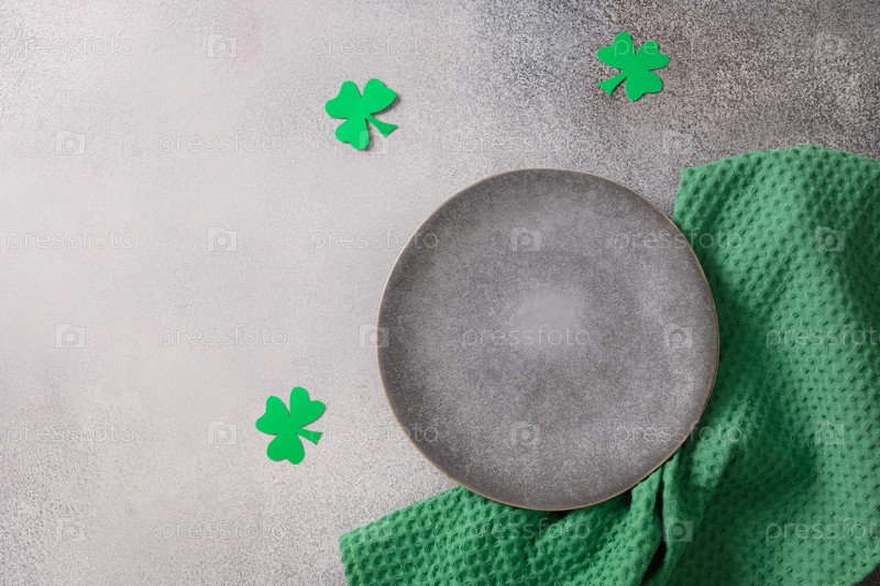 День святого Патрика макет с серой тарелкой и зеленой салфеткой