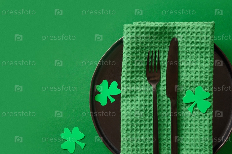 Праздничная сервировка стола с зеленым украшением Дня Святого Патрика на зеленом фоне