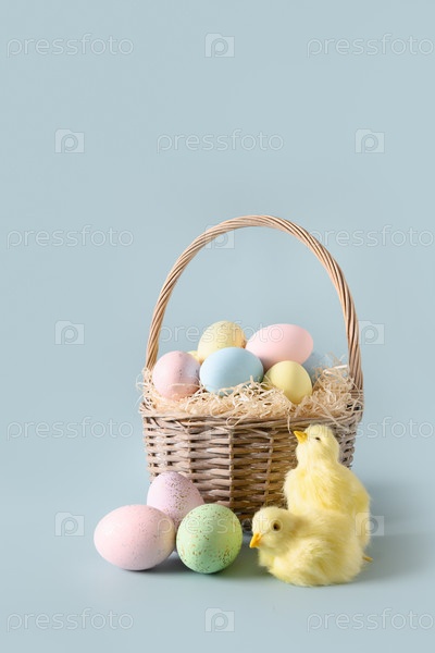 Пасхальная плетеная корзина с пастельными яйцами для счастливого праздника и празднования на синем фоне. Весенняя открытка. Вертикальный формат
