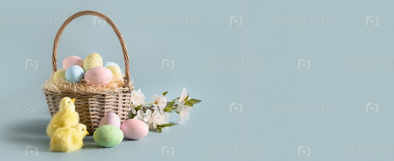 Пасхальная плетеная корзина с пастельными яйцами для счастливого праздника и торжества