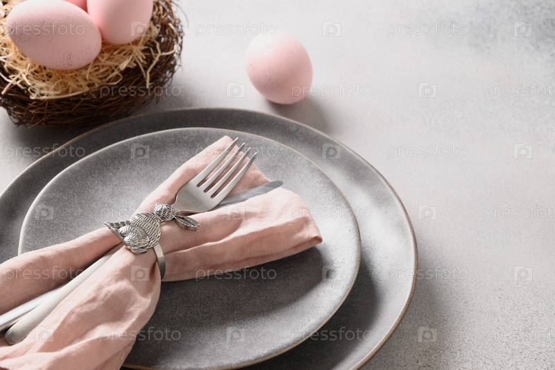 Пасхальный весенний ужин и сервировка стола с розовыми яйцами