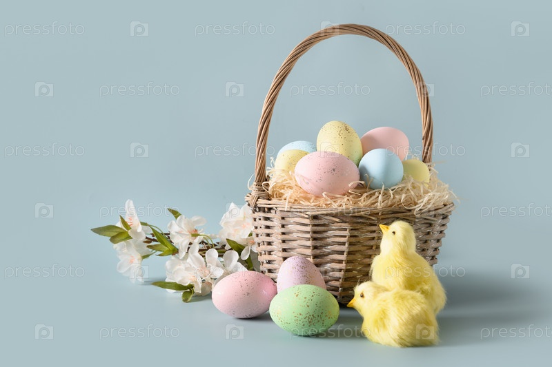 Пасхальная плетеная корзина с пастельными яйцами для счастливого праздника и торжества